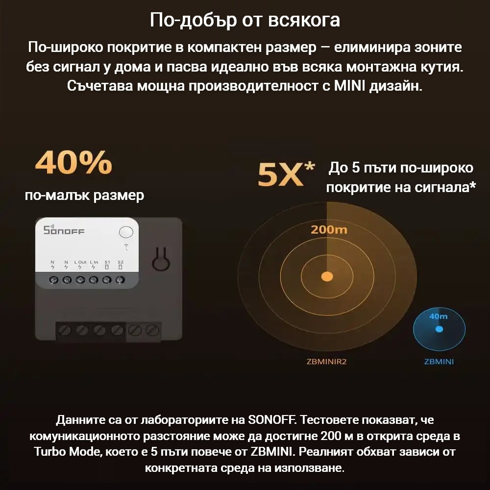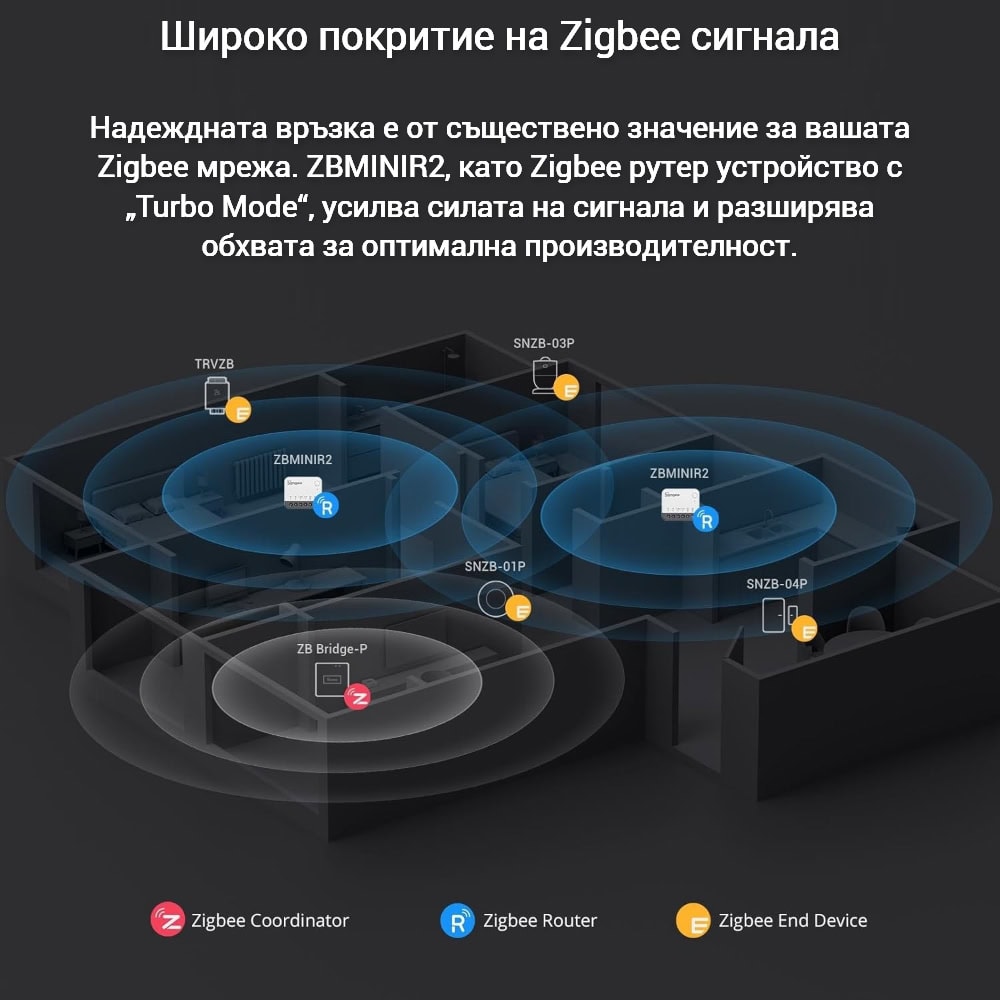 ZBMINIR2 работи като ZigBee рутер в мрежата и предлага функцията Turbo Mode за увеличаване на сигнала и обхвата. В режим Turbo, устройството може да обхване до 200 метра на открито, което е 5 пъти повече от обикновените ZigBee устройства, осигурявайки по-добро покритие в дома и по-стабилна връзка.