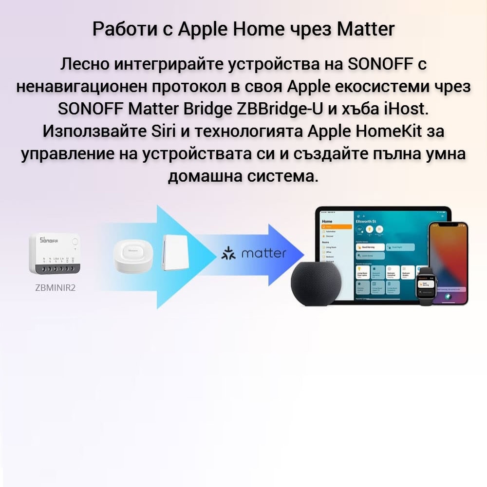 SONOFF ZBMINIR2 Extreme може лесно да се интегрира в екосистемата на Apple чрез SONOFF ZBBridge-U и iHost хъбове. Това позволява управление чрез Siri или Apple HomeKit, осигурявайки удобство и автоматизация на умния дом.