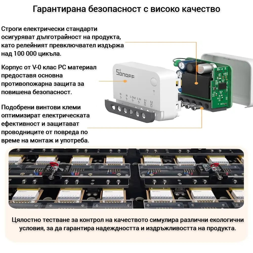 Изработен от V-0 огнеустойчив материал, който осигурява допълнителна защита срещу пожари и други рискове. Също така, релейните превключватели имат издръжливост от над 100 000 цикъла, което означава дълъг живот на устройството.
