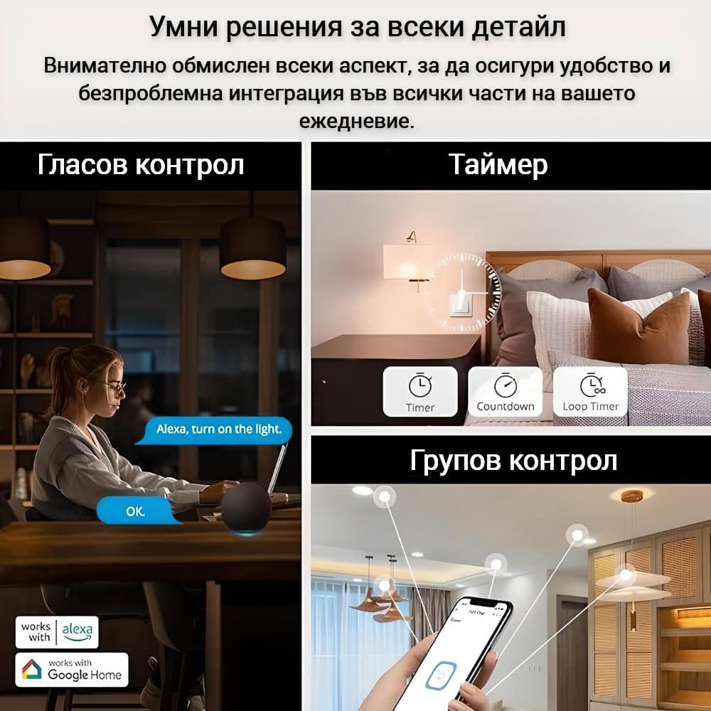 Съвместим е с различни външни ключове и поддържа Detach Relay Mode, което позволява интелигентните крушки да останат онлайн дори при изключен ключ. Разполага с таймери, сцени за автоматизация, забавено включване, групов контрол и OTA актуализации, като работи с различни ZigBee хъбове за максимална гъвкавост.