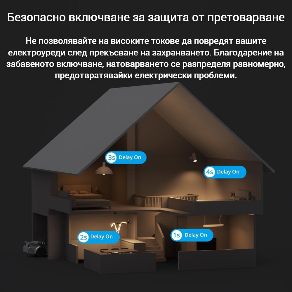 Функцията за забавено включване предотвратява повреди, които могат да се получат от внезапно възстановяване на електрическото захранване след прекъсване на тока. Тя намалява високото натоварване, когато няколко устройства се включат едновременно след рестартиране, осигурявайки дълготрайна издръжливост на вашето оборудване.