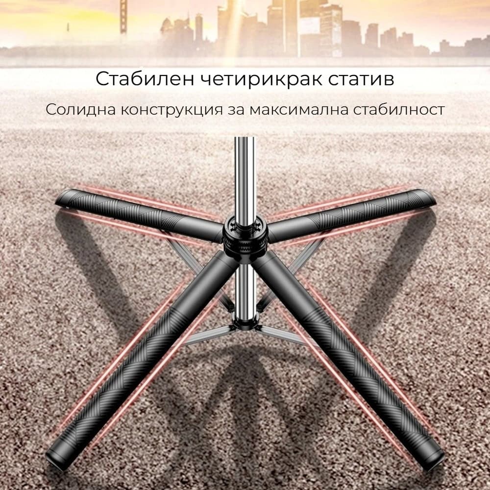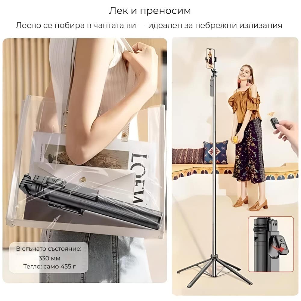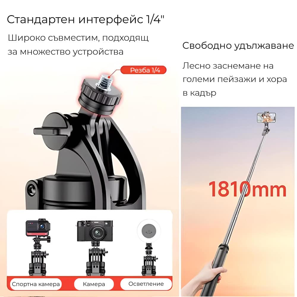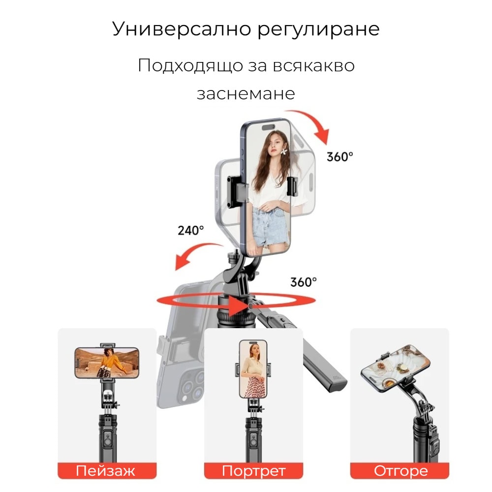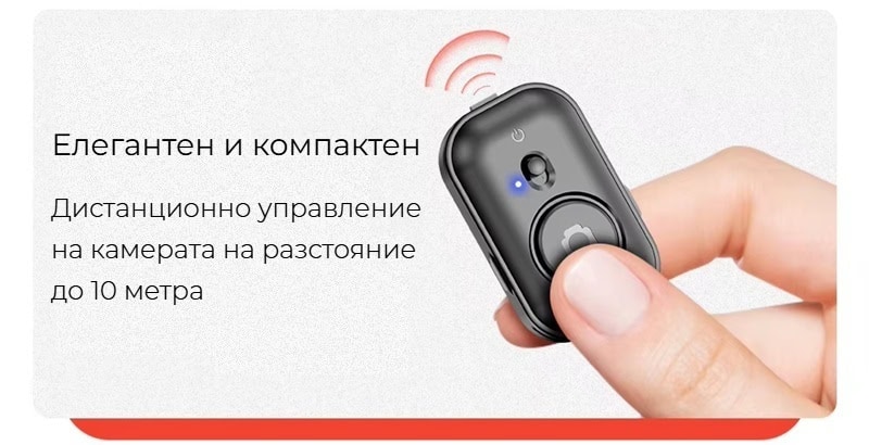 Стабилният четирикрак статив осигурява здраво и сигурно стоене на всяка повърхност, а 360° въртене и наклон дават пълен контрол над композицията. Bluetooth дистанционното позволява лесно снимане без да държите телефона в ръка, а универсалната 1/4″ резба го прави съвместим с повечето смартфони и камери.