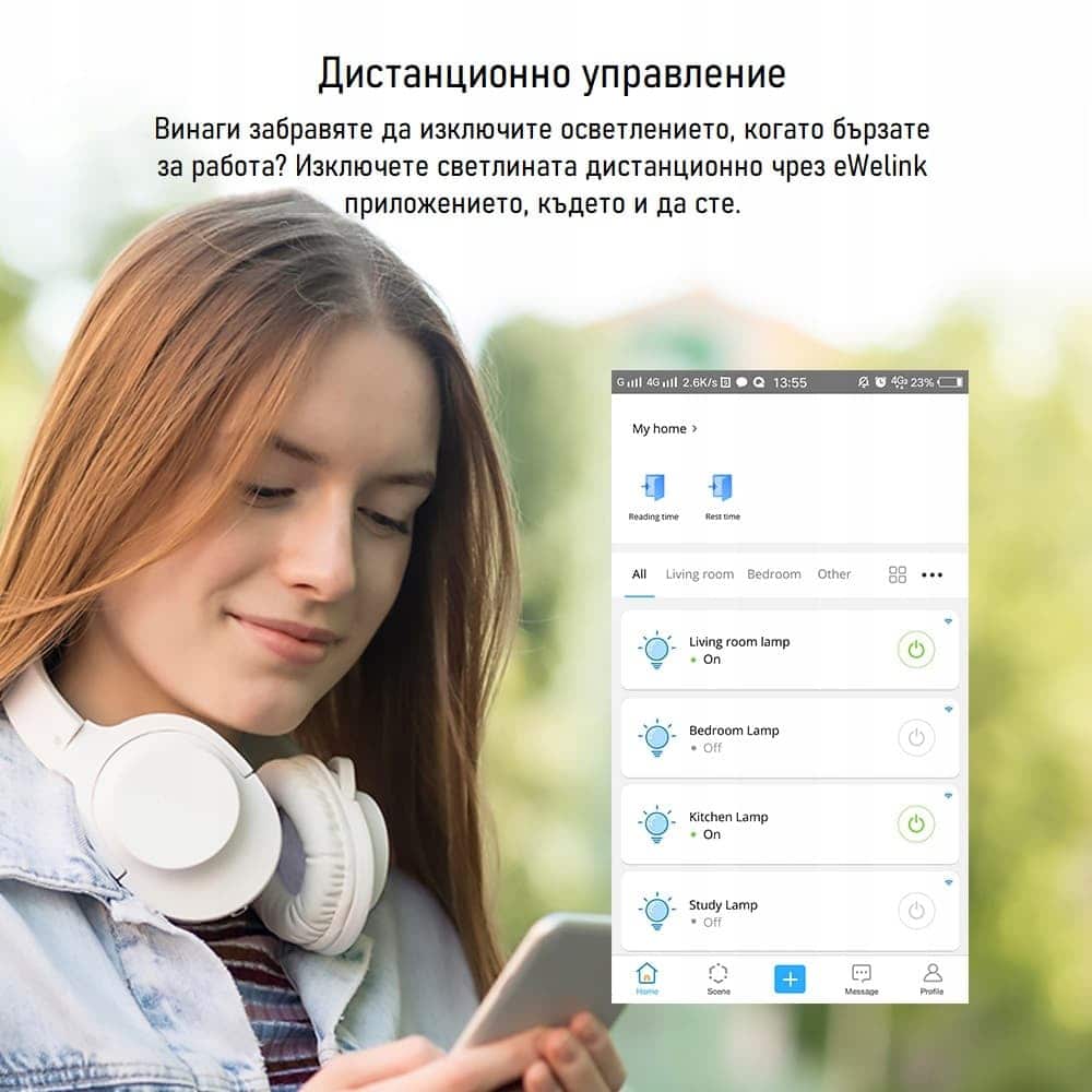 Можете да контролирате осветлението си от разстояние чрез мобилното приложение eWeLink. Това ви позволява да включвате и изключвате светлините, да задавате таймери и да създавате автоматични сценарии дори когато сте извън дома.