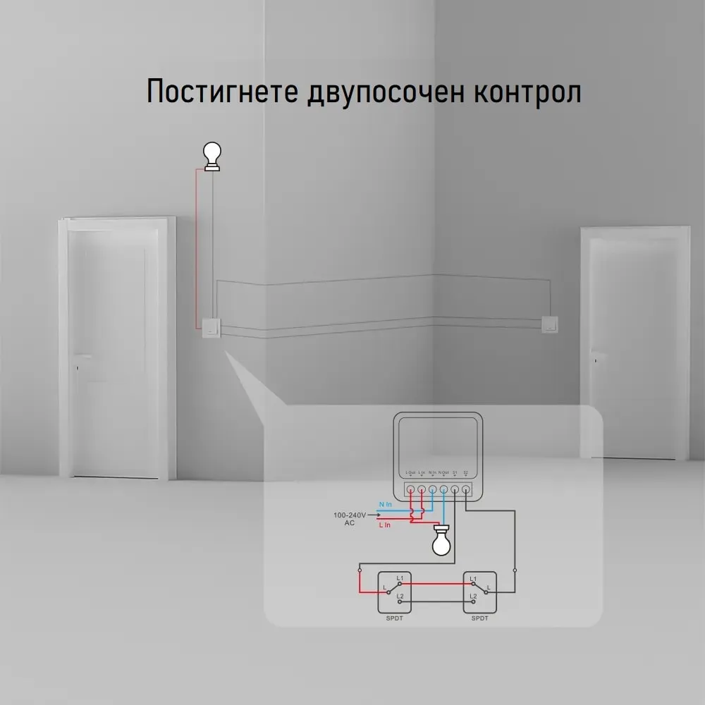 Този Смарт прекъсвач е създаден да работи в комбинация с eWeLink-Remote контрол и бесжичен интелигентен преключвател. Тези допълнителни устройства са специално проектирани за безжично управление на смарт прекъсвача.