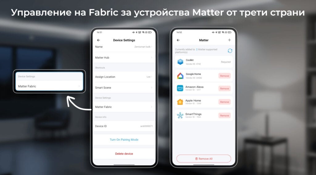 Имате централизиран контрол върху всички платформи, свързани с Matter устройствата ви